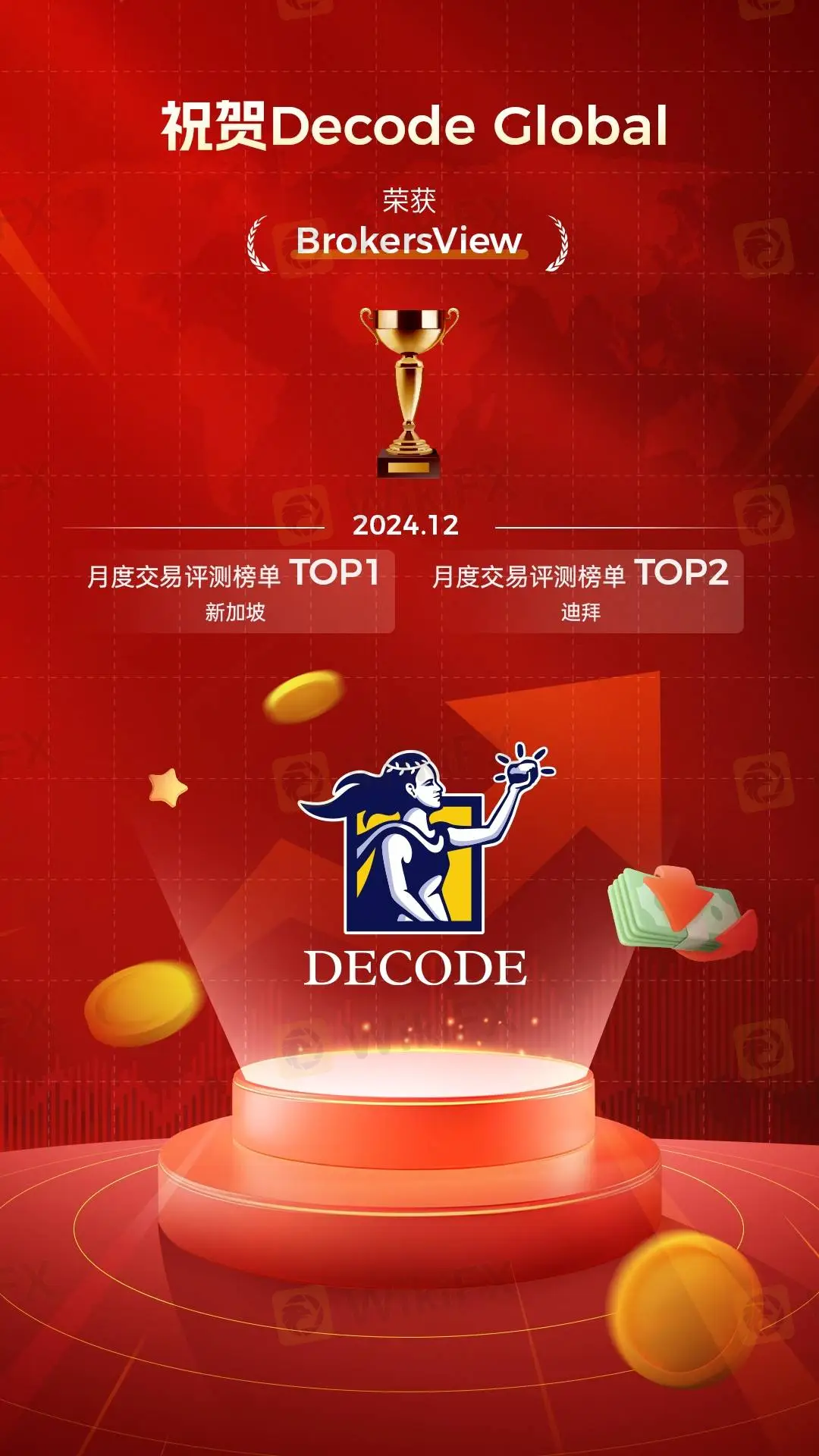 Decode Global在迪拜,新加波,法兰克福等多个地方区评测中表现突出,在26家经济商中脱颖而出,分别登顶BrokersView2024年12月份: