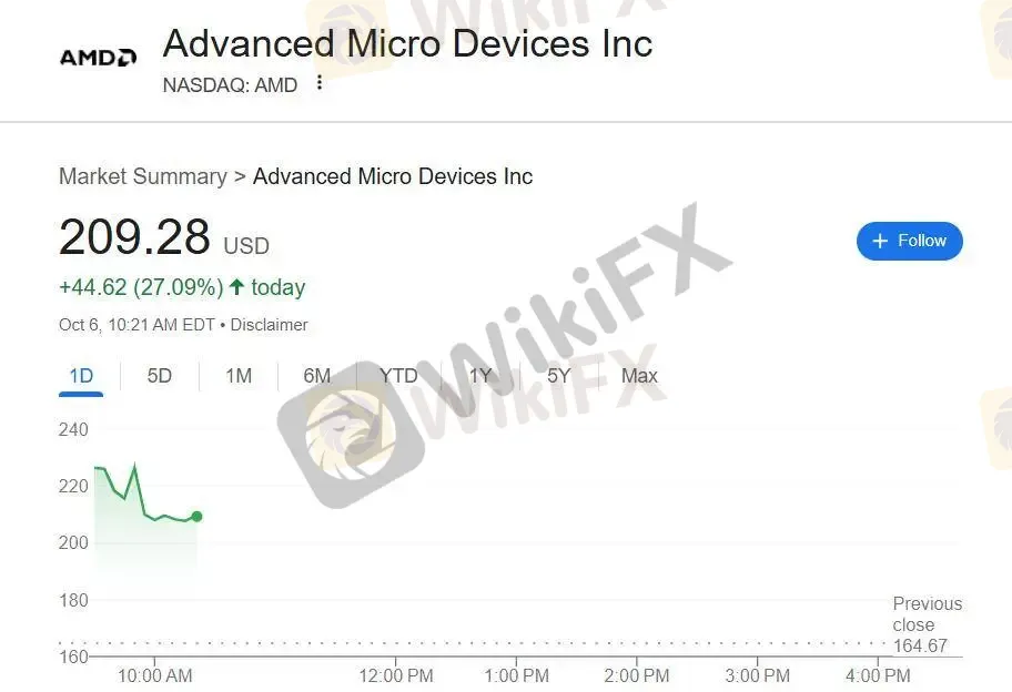 受此消息提振,AMD 股价在盘前交易中一度暴涨 35%,触及 207 美元 的历史高位;英伟达则在盘前下跌约 1%。美股开盘后,AMD 涨势依旧强劲,盘初最高上涨 37.7%,而英伟达则短暂下跌 2.3%。