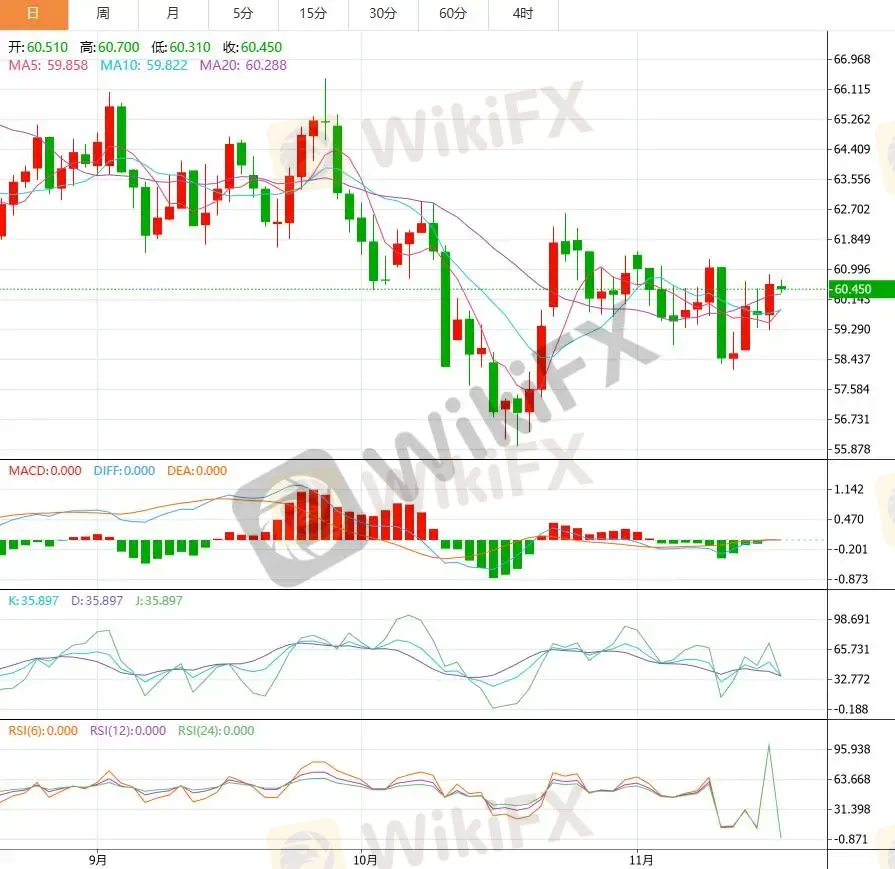 从日线结构来看,WTI 原油价格仍处于弱势震荡区间,目前在 60 美元上方形成阶段性支撑,但上行动能明显不足。均线系统显示,9 日与 20 日均线呈轻微下倾,表明短线走势偏弱。