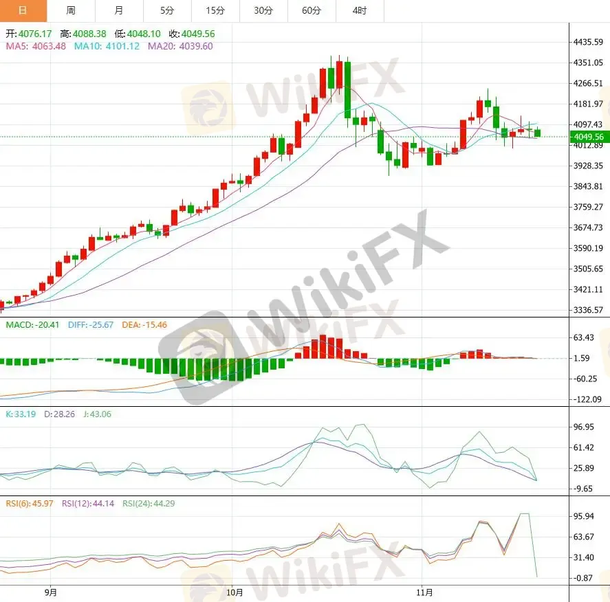 周五(11 月 21 日)现货黄金震荡下行,下跌约 0.60% 至每盎司 4050 美元附近。前一交易日金价剧烈震荡,最终收报 4077.17 美元/盎司,当日最高触及 4110.03 美元,最低下探 4038.82 美元。此前因非农数据带来的涨幅已全部回吐。当前金价较 10 月创下的历史高点 4381.29 美元仍低约 7.00%,但 2025 年累计涨幅仍达 55%。