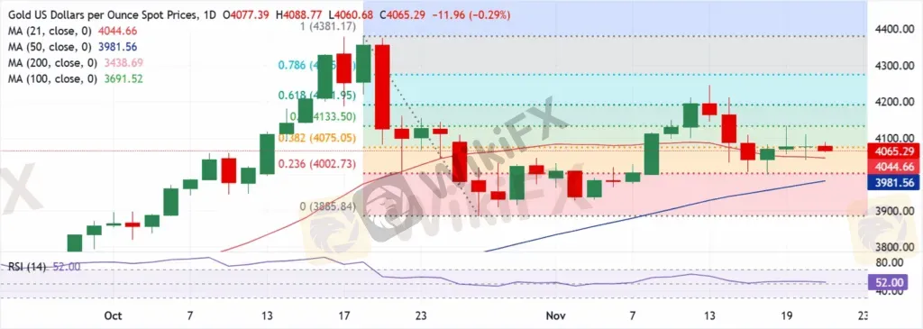 摘要:周五早盘,黄金持续低迷,跌破 $4,100,维持区间交易。在风险厌恶情绪和美联储政策不确定性的影响下,美元在六个月高点下方盘整。在日线 RSI 看涨的情况下,黄金有望持续升破 $4,100,同时 21 日均线支撑稳固。周五早盘,黄金在$4,100关口下方交投,但仍局限在熟悉的区间内,难以找到方向。尽管金价在区间内波动,但本周将以低迷的态势收尾。市场对美国是否会在 12 月降息仍持谨慎态度,尤其是在
