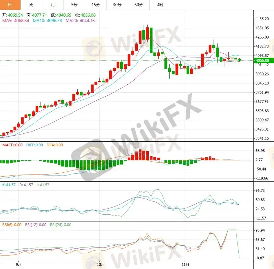 黄金日线图显示价格仍维持在区间震荡中运行。金价稳定在主要短期均线之上,而 9 日与 20 日均线保持多头排列,说明上行动能依旧稳固。MACD 红柱持续放大,动能指标延续多头主导格局,但 RSI 已逼近超买区间,暗示短线可能面临一定回调压力。