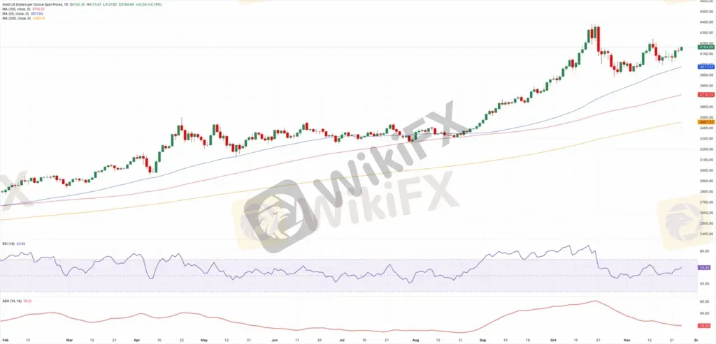 摘要:金价重拾周线升势,并攀升至多日高点。尽管收益率上升和数据向好,美元仍进一步失去牵引力。对美联储进一步宽松政策的押注不断上升,使金属受到支撑。黄金摆脱了周二的小幅下挫,周三升至每金衡盎司 $4170 以上的多日高位。尽管美国国债收益率正试图在整个曲线上反弹,但美元还是再次失去了一些动力。放眼望去,黄色金属仍有望实现连续第四个月上涨,在 10 月份令人印象深刻的涨势基础上向 $4,400 大关迈进。紧