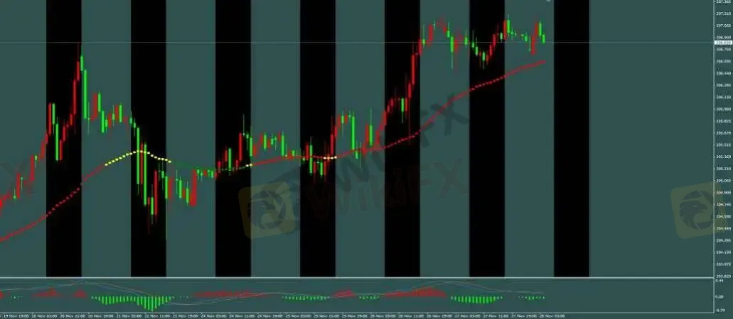 三色线维持红色,H1标准多单已于 205.35 入场并盈利 70 点离场。日内建议结合 M5 基础模型操作。