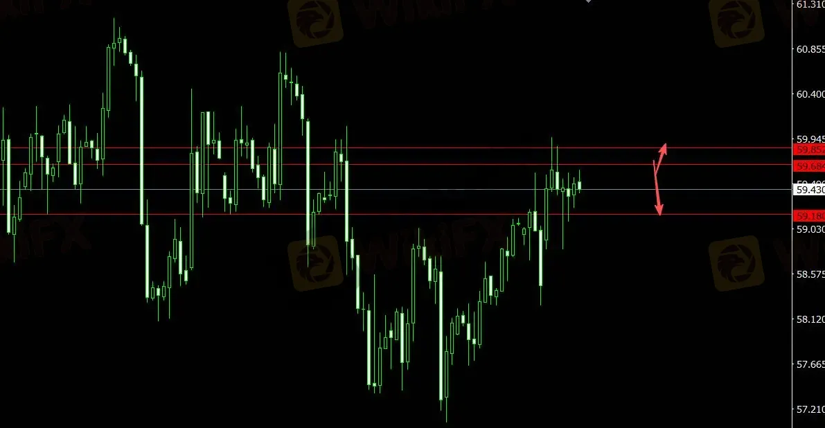 美元指数受支撑,原油承压,关注支撑位59.180,4小时看多至59.850;关注压力位59.680,4小时看空至59.060。