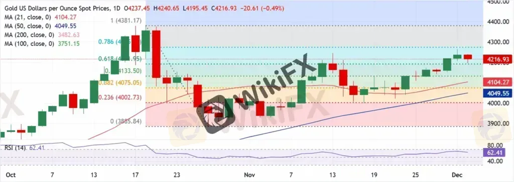 从 4,381.17 美元的高点到 3,885.84 美元的低点计算出的斐波那契回撤位显示,61.8% 的回撤位 4,191.95 美元目前位于价格下方,而 78.6% 的回撤位 4,275.16 美元则限制了价格的上涨。如果日线收盘价高于该回撤位,则可能开启进一步上涨的空间;而回调时,价格可能会受到 4,104.27 美元附近的 21 日均线支撑,从而维持看涨趋势。