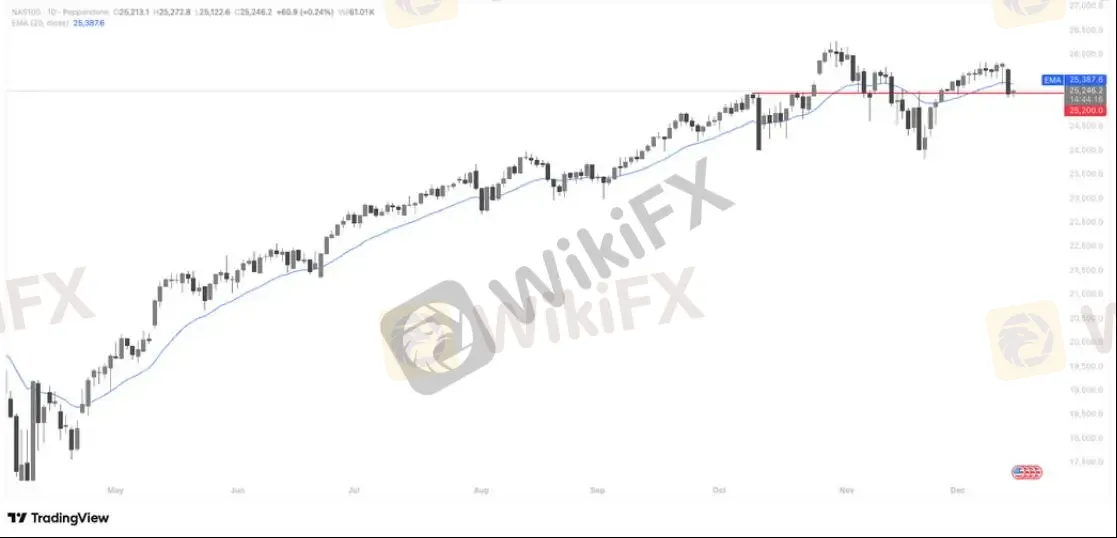 纳指日线仍维持上升趋势,但短线进入关键分歧区间,指数在 20 日 EMA(约 25,387)附近反复拉锯,显示多头动能放缓、情绪降温;当前 25,200附近构成重要结构支撑,若能守稳并重新站回均线,走势仍属趋势中的健康整理,有望再度测试前高区间;反之,一旦有效跌破该支撑,回调级别可能放大,指数或回测 24,700–24,900 区域。整体而言,趋势未破但波动上升,短线以震荡消化为主,需等待方向确认。