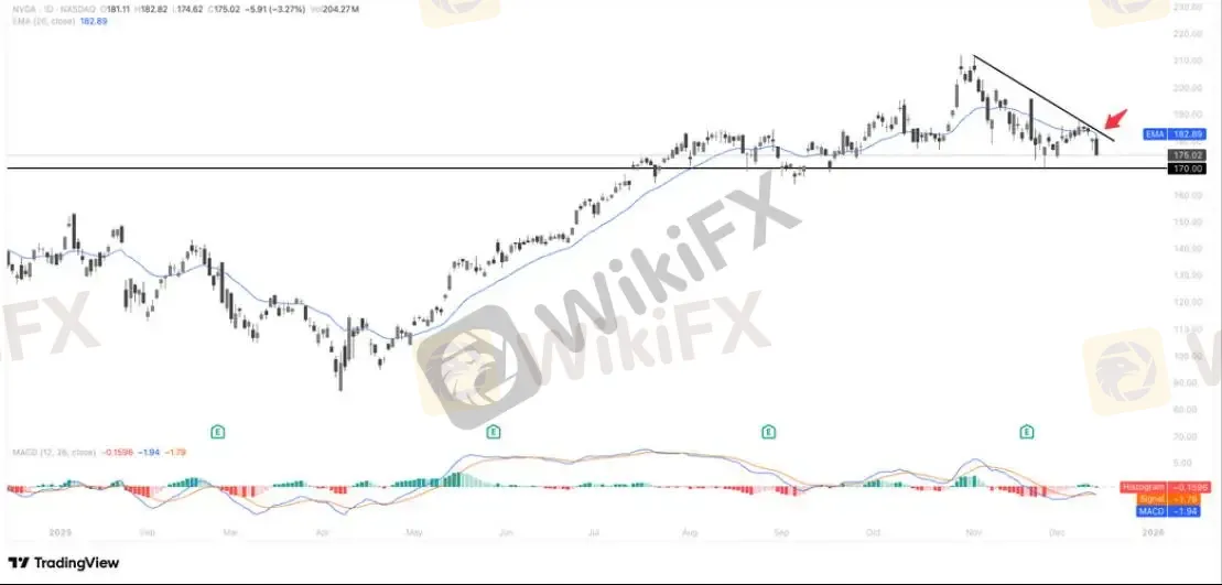 英伟达自 11 月19 日财报发布后,股价进入震荡走弱格局,整体呈现趋势性降速特征:当前价格运行在 20 日 EMA(约 183 美元)下方,并持续受制于清晰的下降趋势线压制,显示短线反弹动能受限;下方 170 美元 构成重要中期支撑,一旦有效跌破,回调级别可能进一步放大。动能指标方面,MACD 仍位于零轴下方,修复尚未完成,反映市场仍在消化高估值压力及 AI 投资回报预期降温的影响。整体结构更偏向高位回撤后的技术性整理,短期方向仍需等待趋势线突破或关键支撑的有效确认。