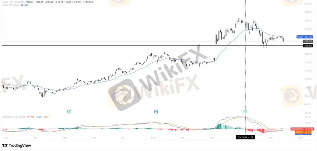 AMD 日线显示,股价在前期快速拉升后进入高位回调与震荡整理阶段:当前价格回落至 20 日 EMA(约 221)下方,短线趋势转弱,上方抛压仍在释放;下方 200 美元 构成关键中期支撑,一旦失守,回调空间可能进一步打开。动能指标方面,MACD 已跌回零轴下方,且绿柱延续,表明上涨动能明显降温,资金正从高弹性的 AI 半导体中阶段性撤出。整体结构更偏向急涨后的技术性修正,短期需观察 200 美元支撑能否企稳,或等待重新站回均线后再判断新一轮方向。