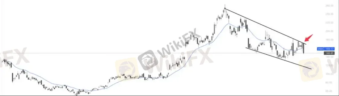 ALAB 周五在上攻上方压力线时未能形成有效突破,且伴随放量回落,表明回调趋势仍在延续;当前股价运行于 20 日 EMA(约 159)下方,趋势动能偏弱,空方仍占据主动。整体结构更符合高位回撤后的下降通道整理形态,短线不排除进一步回踩通道下沿或前低支撑的可能。操作上建议降低仓位或平仓、以风险控制为主,耐心等待结构企稳后更合适、胜率更高的再度加仓机会。