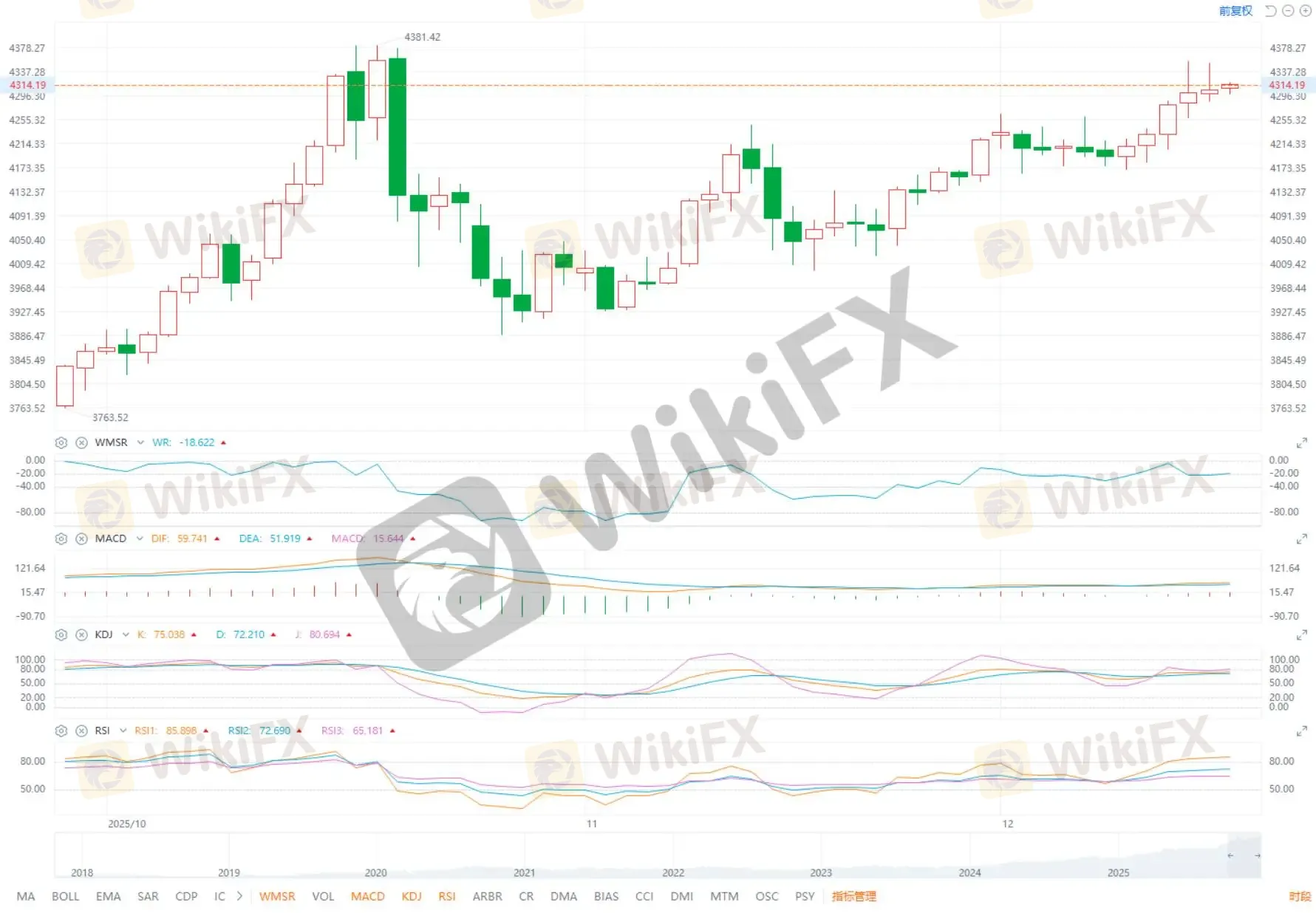 12月16日(周二)截至发稿,金价延续震荡格局,小幅上行,目前交投于 4308 美元/盎司附近,市场整体保持谨慎,等待宏观数据进一步指引。