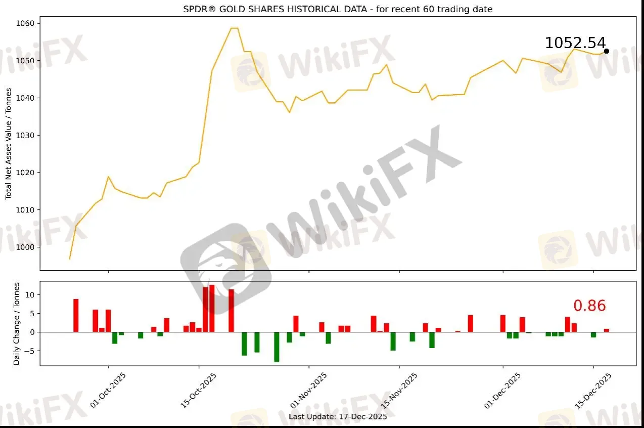 截至12月17日,全球最大的黄金ETF SPDR Gold Trust持仓量为1052.54吨,较上一个交易日增加0.86吨。12月17日现货黄金自4302.18美元/盎司开盘后震荡上行至4340美元一线受阻,回落至4307美元/盎司附近弱整理。欧盘尾盘开始在4322-4348美元区间高频宽幅震荡,最高向上触及4349.5美元/盎司。最终收于4338.83美元/盎司,涨36.65美元或0.85%。