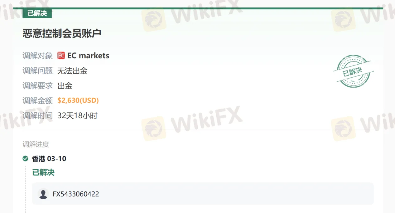 近期,外汇天眼亦收到多条涉及 EC Markets 的客户投诉。在双方积极配合与沟通的过程中,大部分问题已得到阶段性解决。