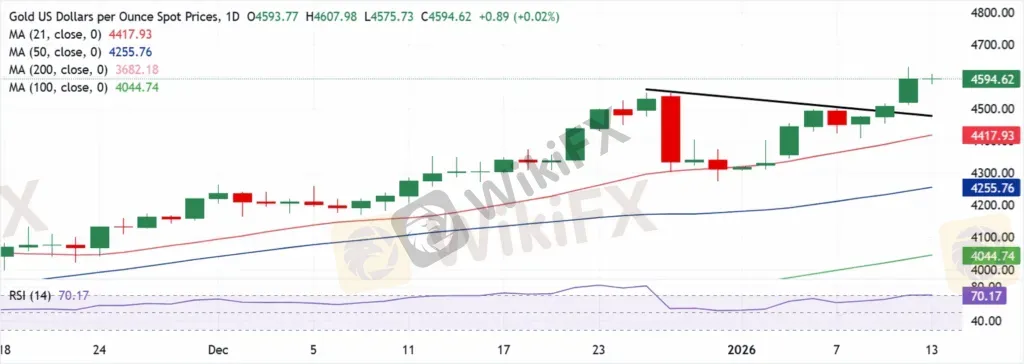 日线图上,XAU/USD 报 $4,594.62。21 日均线攀升至 50、100 和 200 日均线上方,表明看涨势头强劲,价格维持在所有均线上方,强化了积极的基调。14 天相对强弱指数为 70.17(超买),可能会出现暂停或浅度回调。位于 $4,417.93 的 21 天均线提供了直接的动态支撑,价格在其上方的上涨势头保持不变。