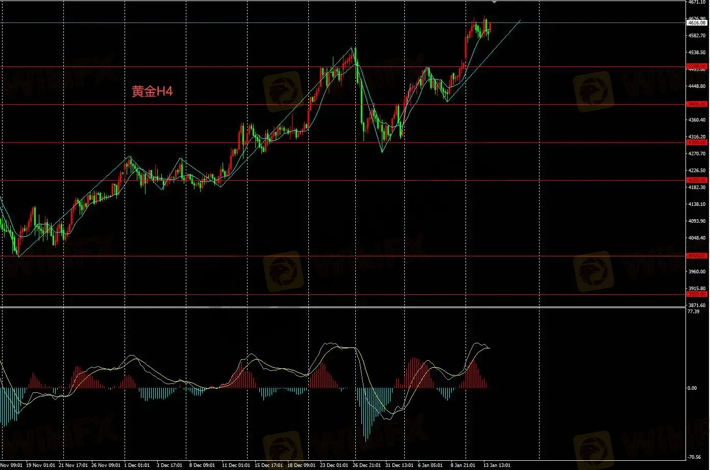 H4图表金价短期看多,只要价格维持在4500上方则持续看多,逢低买入策略。