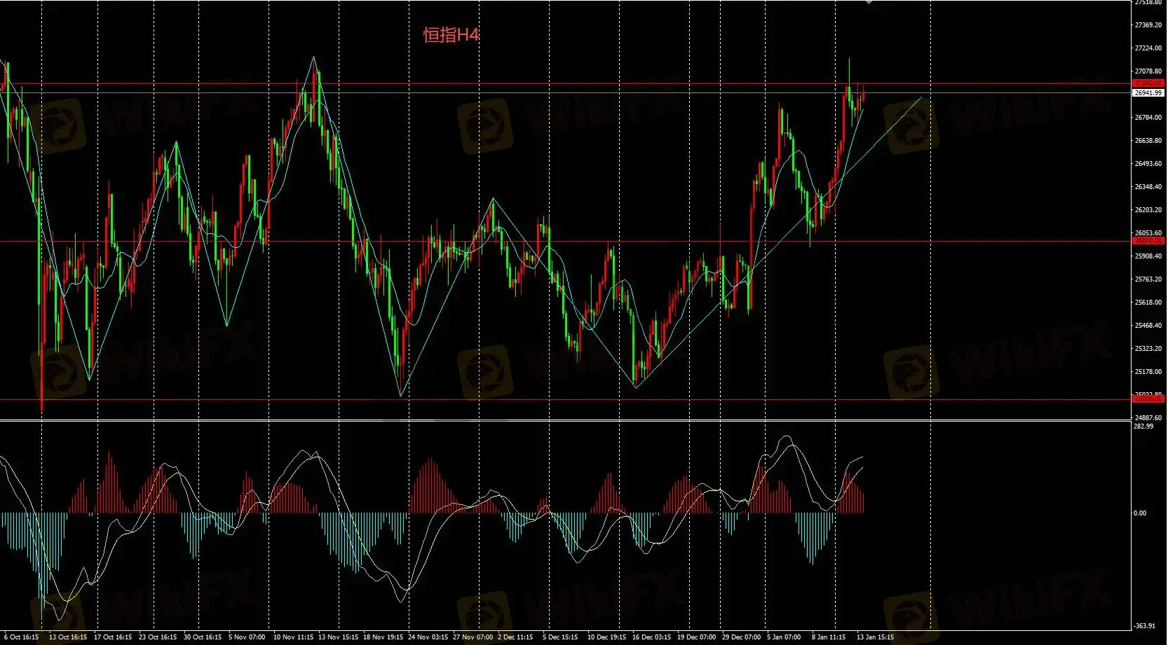 恒指H4若不能上破27000,则短期或持续下挫,下方支撑位26500。