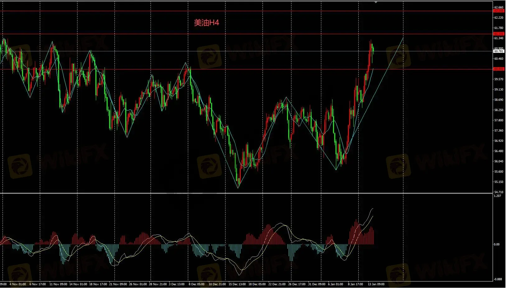 美油H4若日内不能上破61.5关口,日内或短期下挫,但总体仍然看多。
