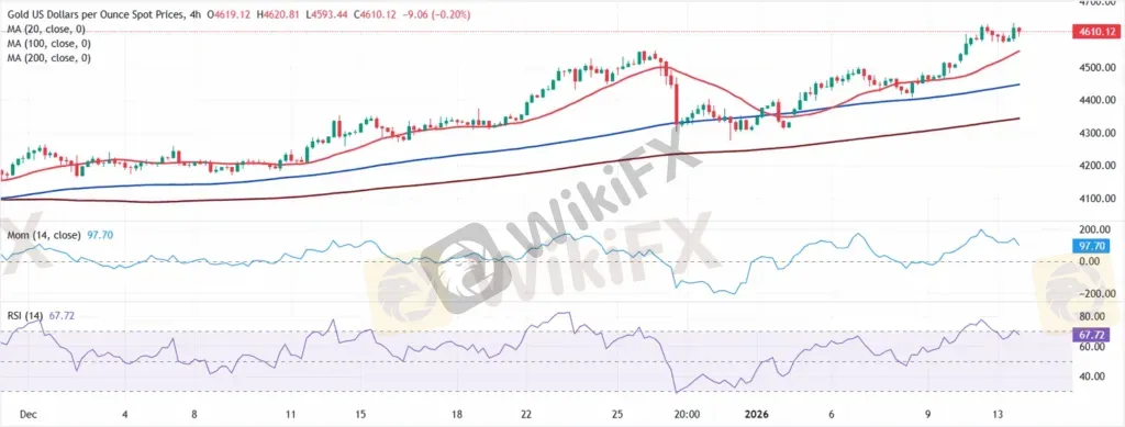 4 小时图显示,XAU/USD 在 $4,610 附近交投,保持积极基调。20 期均线位于 100 期和 200 期均线上方,三条均线均向高处倾斜,而价格则在所有均线上方发展,凸显出坚定的看涨倾向。20 SMA 目前位于 $4,548.34,为附近提供动态支撑。同时,动量指标在积极水平内缓和,而 RSI 指标在 67 点左右转为中性,反映出最近的运行正在暂停。
