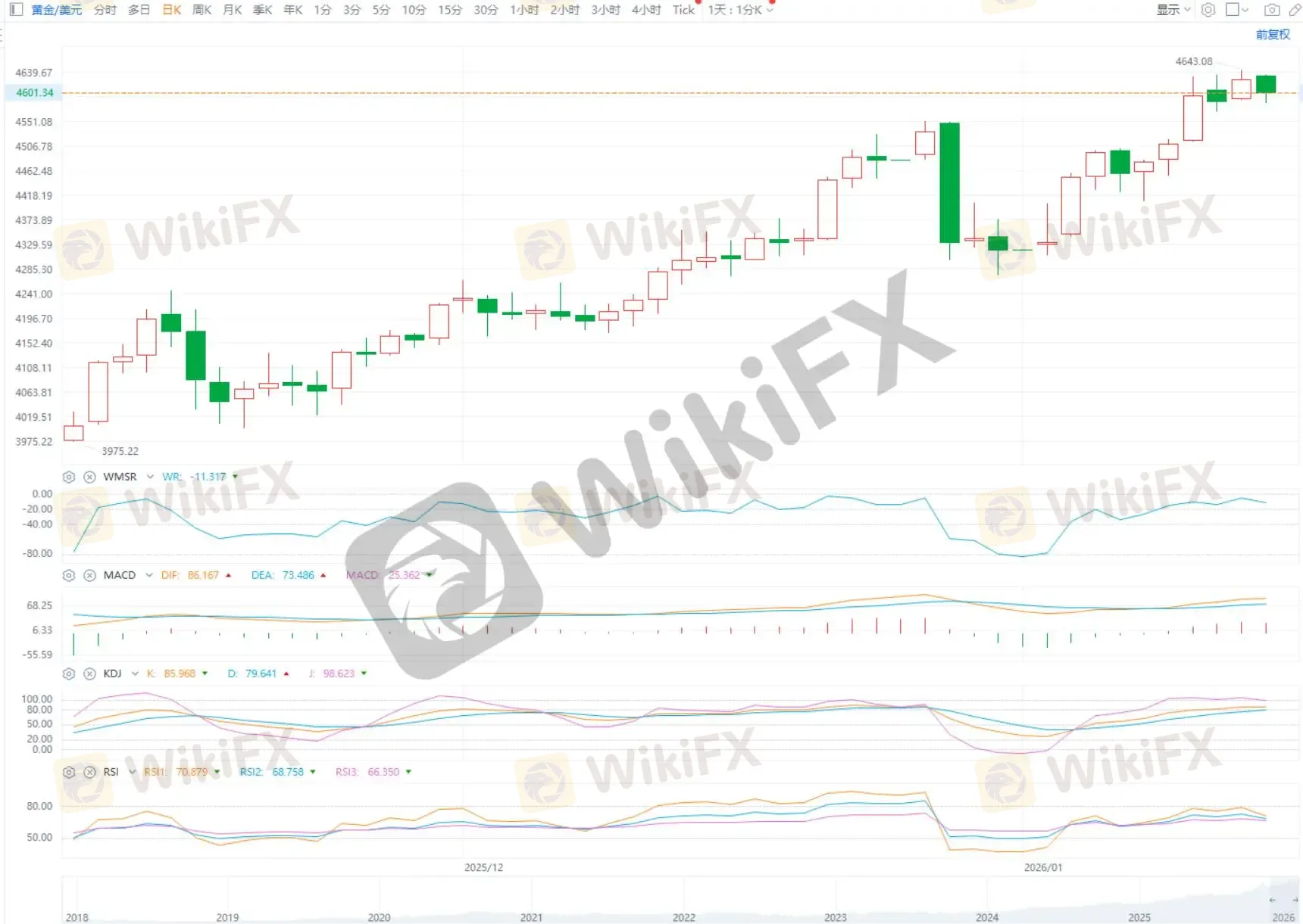 金价在连续刷新历史高点后,短线出现高位震荡迹象。当前价格在 4640 一线附近形成关键多空分水岭,上方若能有效站稳,仍具备进一步冲高动能;反之,若受阻回落,则不排除向 4600 附近回踩、消化涨幅的可能。整体趋势仍偏多,但短线波动明显放大。