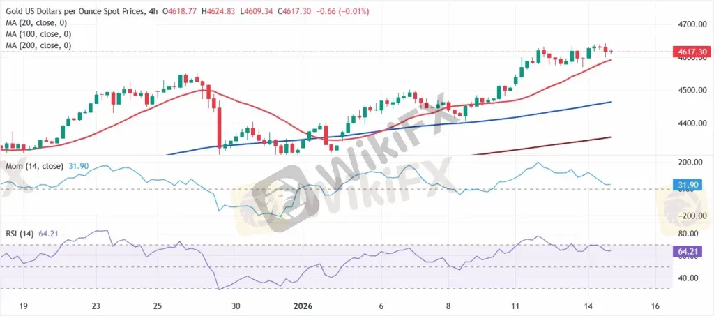 4 小时图显示,XAU/USD 保持积极基调,在所有移动均线上方交投。20 期均线升至 100 期和 200 期均线上方,较短均线 $4,591.39 提供了初步动态支撑。同时,动量指标在中线上方走平,而 RSI 指标为 64,也缺乏方向性力量。