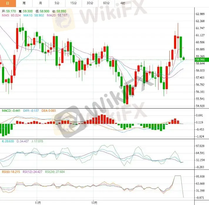 从技术层面观察,油价日线结构出现明显转弱迹象。WTI 在前期冲高后于 62 美元一线遭遇明显阻力,随后以中阴线跌破 60 美元整数关口。当前价格已回落至 20 日均线下方,且 5 日均线与 10 日均线呈现死叉迹象,显示短期空头动能占据主动。指标方面,MACD 的快慢线在零轴上方拐头向下,红柱明显缩短,动能由多转空;RSI(14)从超买区回落至 48 附近,表明市场情绪快速降温。关键支撑位集中于 58.80 — 59.00 美元区域,该位置为前期平台与 60 日均线交汇处,若有效跌破,下一目标可能指向 56.50 美元;上方阻力则位于 60.0 美元与 62.00 美元。整体来看,日线级别已转为震荡偏空结构,短期反弹更可能被视为修复性行情。