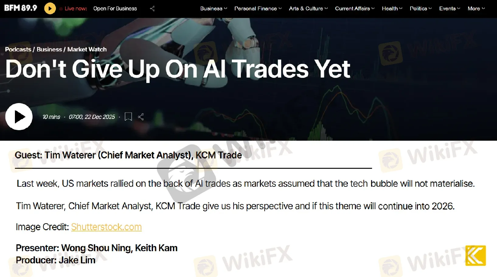 12月期间,KCM Trade 首席市场分析师、《福布斯》澳大利亚顾问委员会成员 Tim Waterer 受邀亮相英国广播公司(BBC)、土耳其广播电视总台世界频道(TRT World)、澳大利亚商业电视台(Ausbiz TV)、彭博联合阿拉伯商业新闻台(Asharq Business with Bloomberg)等多家国际主流媒体,就2026年即将到来的全球市场走势、货币政策、大宗商品、股票市场及宏观经济风险发表专业评论。