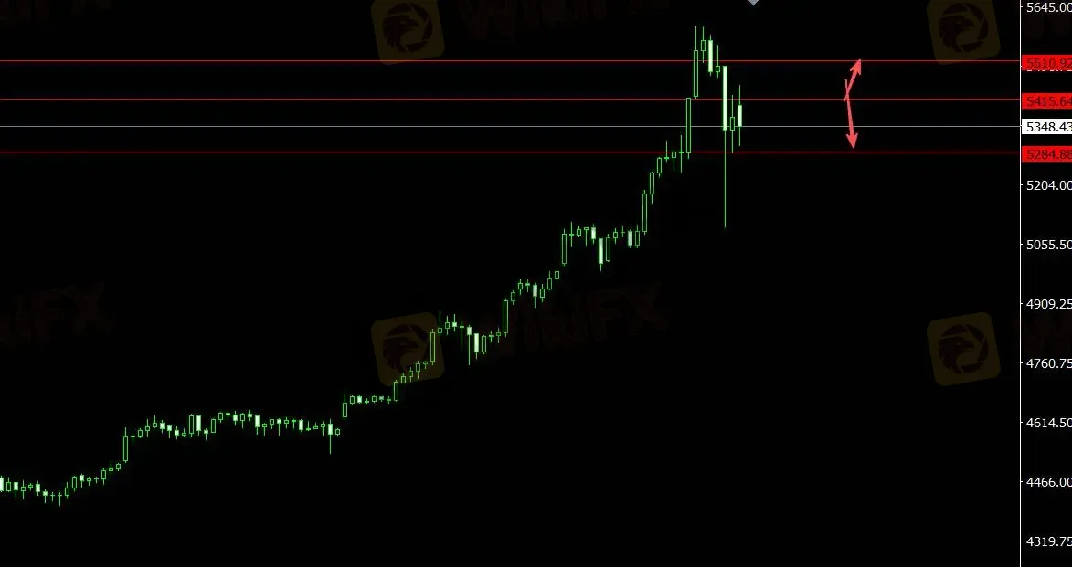 美元指数受支撑,黄金承压。关注支撑位5284.90,4小时看多至5510.90,关注压力位5415.60,4小时看空至5234.50。