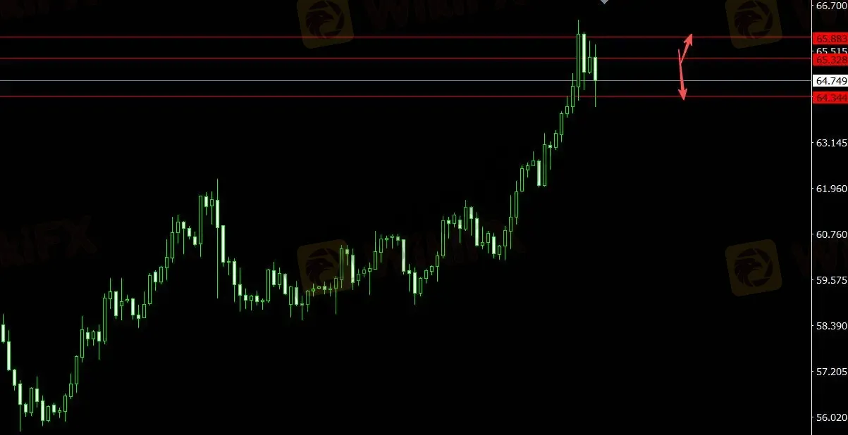 美元指数受支撑,原油承压,关注支撑位64.340,4小时看多至65.880;关注压力位65.330,4小时看空至63.850。