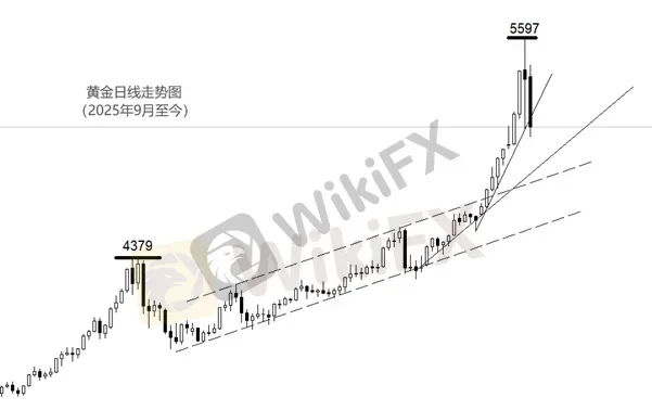 ATFX:没有只涨不跌的行情。1月份黄金延续疯牛趋势,昨日最高触及5597美元,刷新历史纪录。空头开始发力,黄金当日收盘至5370附近。今日亚盘和欧盘,空头动能延续,多头开始大溃败,盘中最低价已经达到5057美元,距离5000美元关口仅一步之遥。