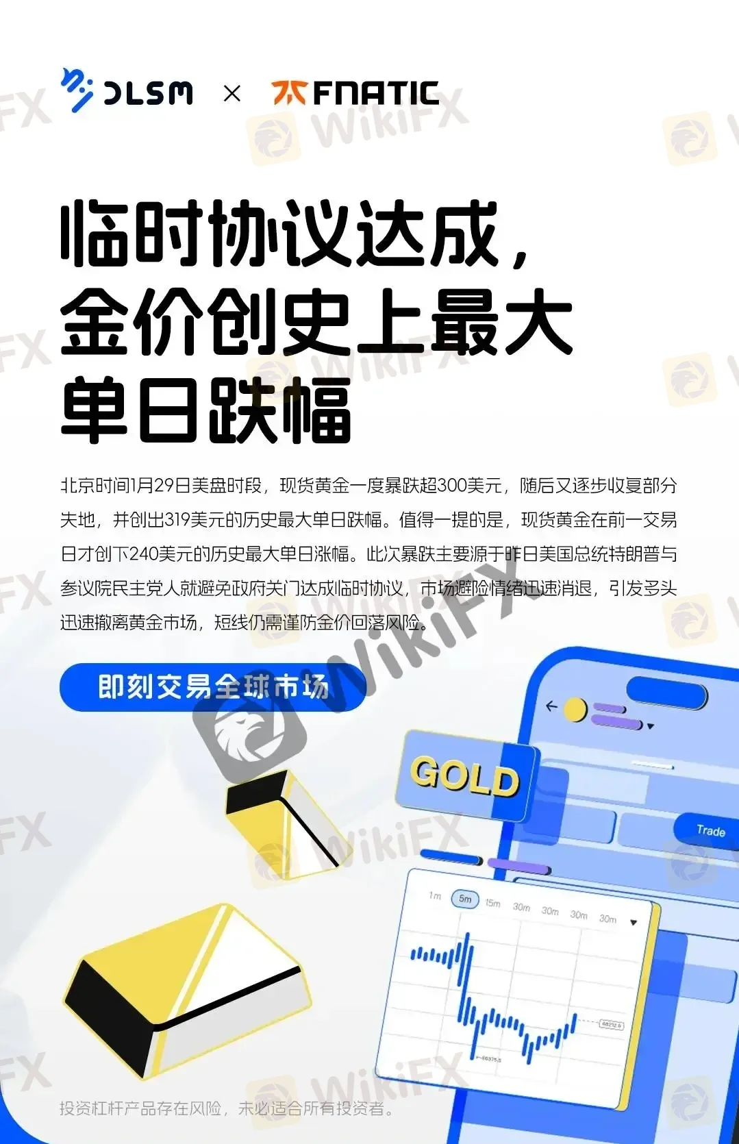 摘要:北京时间1月29日美盘时段,现货黄金一度暴跌超300美元,随后又逐步收复部分失地,并创出319美元的历史最大单日跌幅。值得一提的是,现货黄金在前一交易日才创下240美元的历史最大单日涨幅。此次暴跌主要源于昨日美国总统特朗普与参议院民主党人就避免政府关门达成临时协议,市场避险情绪迅速消退,引发多头迅速撤离黄金市场,短线仍需谨防金价回落风险。