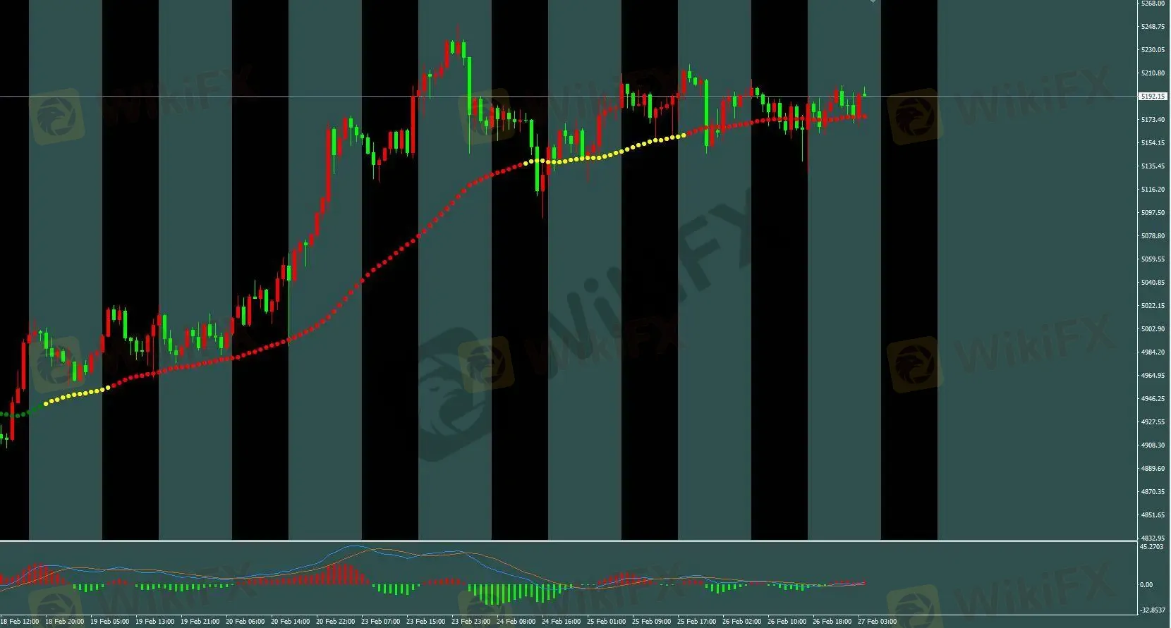 当前 H1 三色线已由黄转绿。此前 H1 标准多单已按规则变色平仓。现等待价格线接近三色线附近,开仓 H1 标准空单,止盈目标 70 点,保护性止损设于开仓位上方 120 点。日内短线可结合 M5 基础模型进行操作。