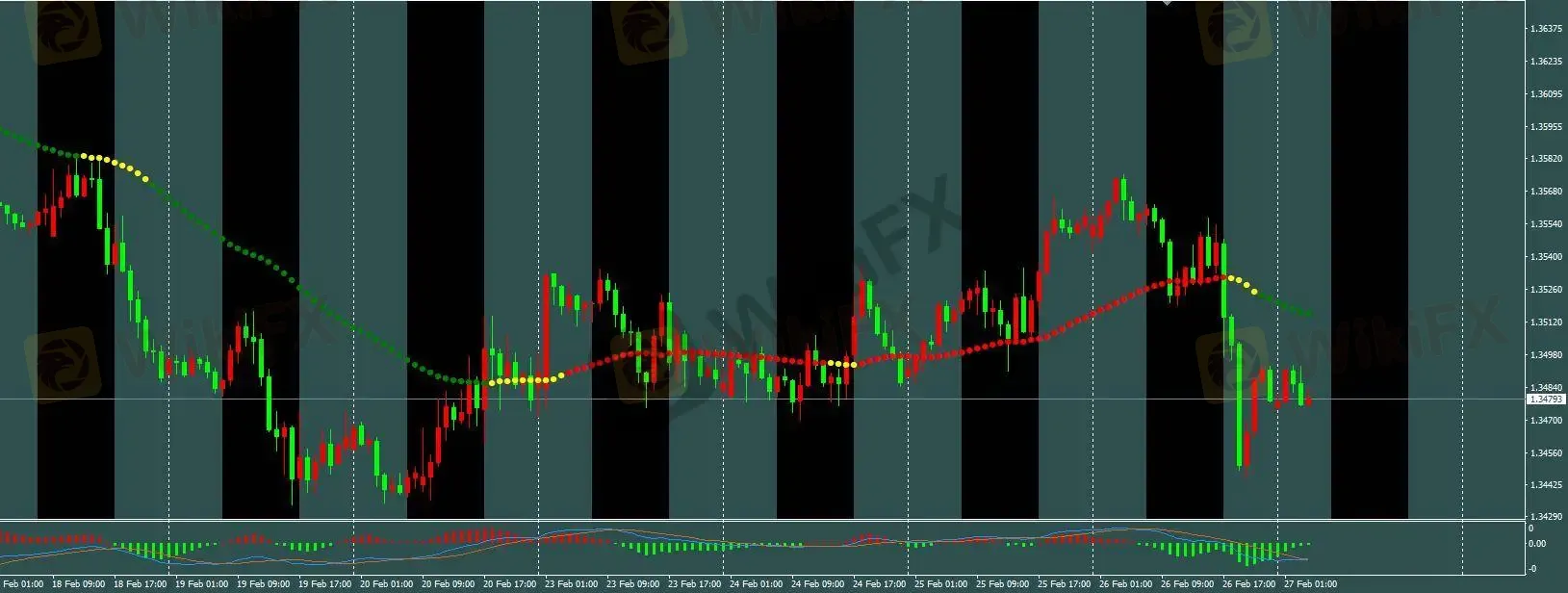 当前 H1 三色线已由黄转绿。根据 H1 模型,等待价格回调至趋势线附近时入场做空。保护性止损设于上方 1.357 附近,盈利目标为开仓价下方 60 点。若三色线变红则平仓离场。