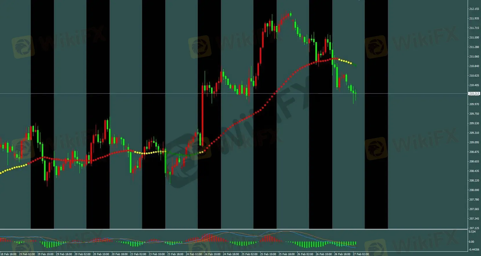 昨日镑日行情反转下跌,全天走出约 167 点,日线收出大阴线。亚盘跳空低开后持续走弱,欧盘时段虽有反弹,但美盘时段再次加速下行,最低触及 210.25 附近。今日早盘行情再度跳空低开,测试 210 支撑位。技术面上,4 小时 MACD 形成死叉,但 M30 出现背离信号,下跌动能或有所减弱。
