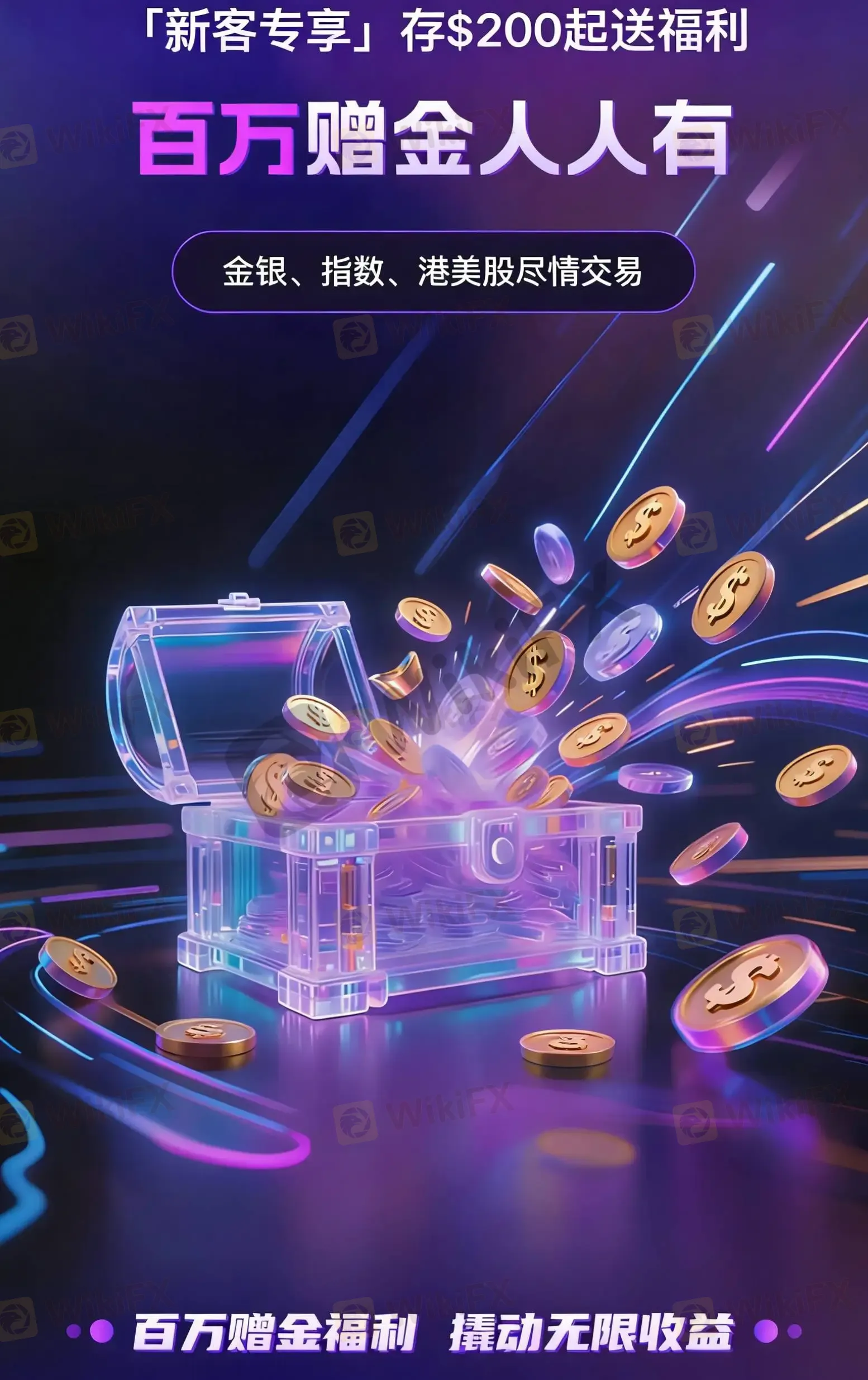 2026 年 3 月新客专属福利重磅上线💥,首次激活账户并注资≥200 美元,即可解锁阶梯式赠金、24 小时激活红包及额外交易返利,最高赠金达百万美金💰,助力新手轻松布局贵金属与指数交易,把握行情红利📈。