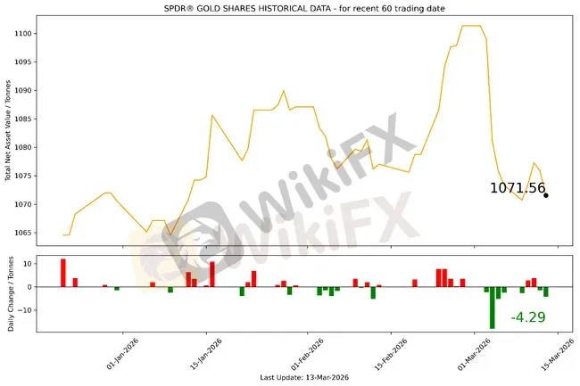 截至2026年03月13日,全球最大的黄金ETF SPDR Gold Trust持仓量为1071.56吨,较上一个交易日减少4.29吨。2026年03月13日现货黄金开盘于5080.27美元/盎司,亚盘和欧盘时间在5070-5120美元区间宽幅震荡;美盘交易时间震荡下行,最低向下触及5009.84美元/盎司,最终收于5018.098美元/盎司,跌61.972美元或1.22%。
