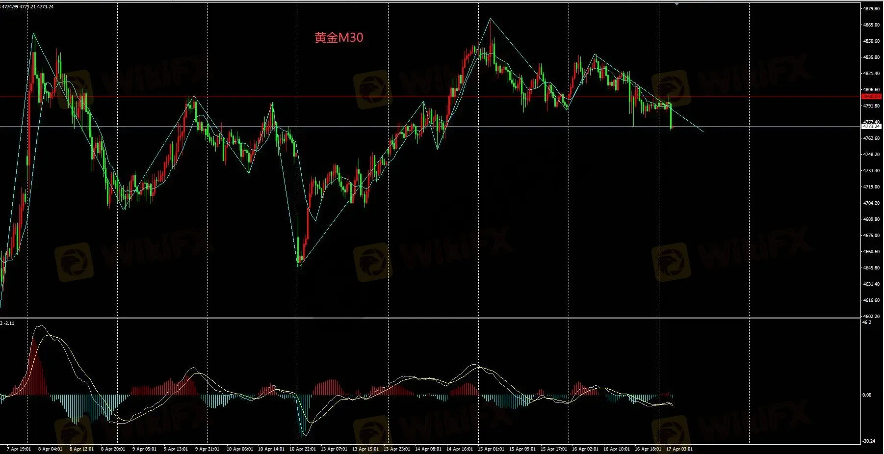 M30图表金价日内逢高卖出操作,上方压力位4800,只要金价维持在该价位下方运行日内持续看空。