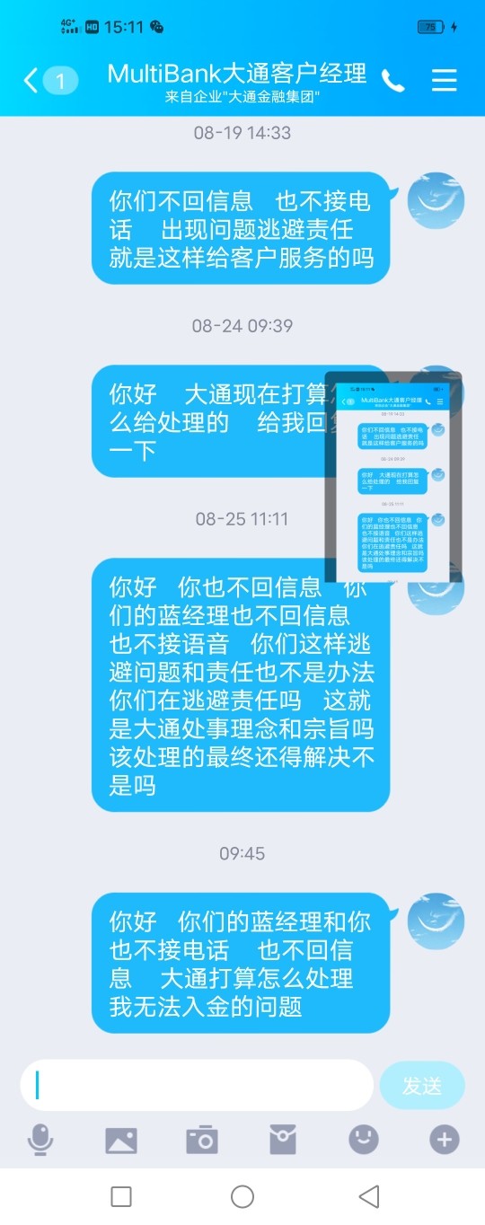 大通金融,技术问题,无法入金导致爆仓!客户经理不负责任,现在把我拉黑了!