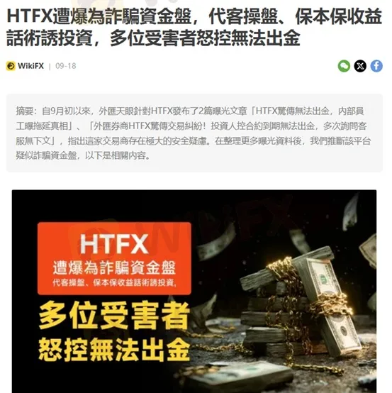 各位投資人請注意,外匯天眼在2025/9/18曾發布關於HTFX的曝光文章「HTFX遭爆為詐騙資金盤,代客操盤、保本保收益話術誘投資,多位受害者怒控無法出金」,指出該平台遭到大量用戶投訴,有極大的資金盤嫌疑。過去1個月以來,相關的爆料絡繹不絕,整體情勢愈來愈不樂觀。