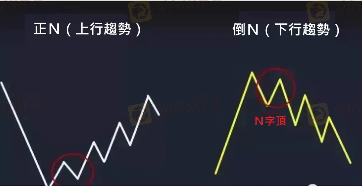 在實際走勢中,N字形態不會像上圖中那麼「完美」。在N字頂或底出現後,大多時候行情會多次調整後才出現明顯的趨勢。正N出現在上行趨勢,倒N出現在下行趨勢。