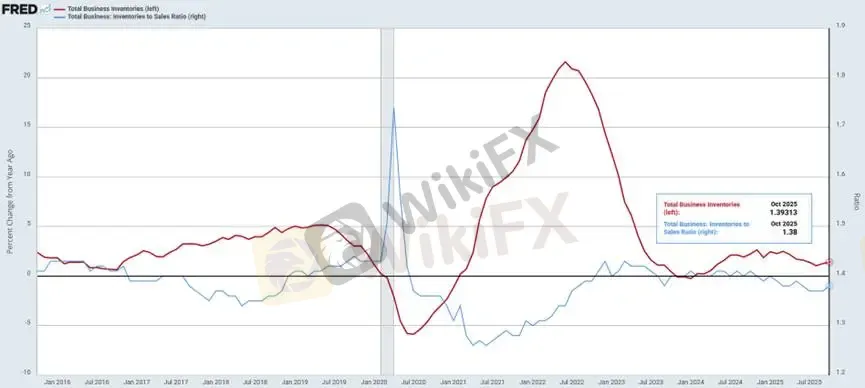 (圖四、美國10月商業庫存&庫存銷售比;資料來源:Fred)