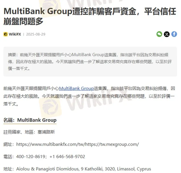摘要:2025年8月,外匯天眼曾經發布「MultiBank Group遭控詐騙客戶資金,平台信任崩盤問題多」這篇報導,指出該平台與客戶傳出交易糾紛,還試圖撇清責任,存在極大的安全風險。過去這幾個月,我們仍持續收到各種投訴與爆料,下面就帶大家一起了解相關案例。